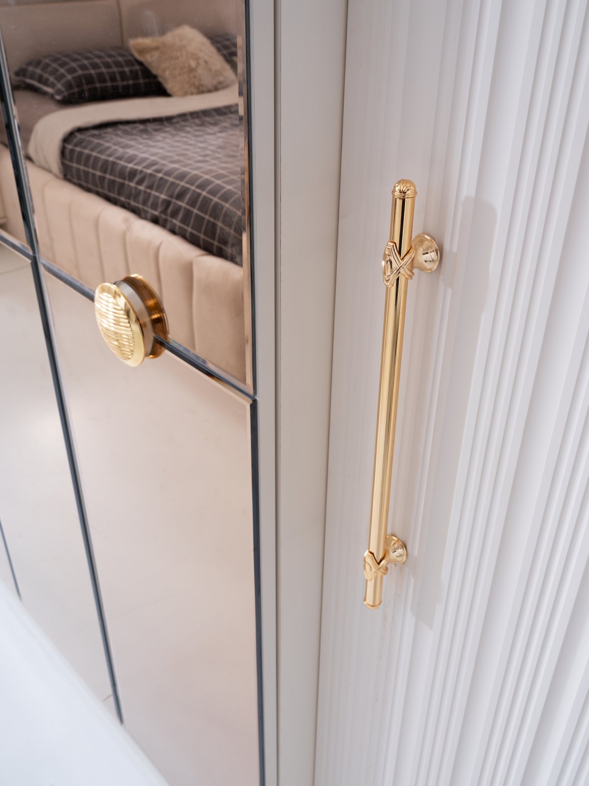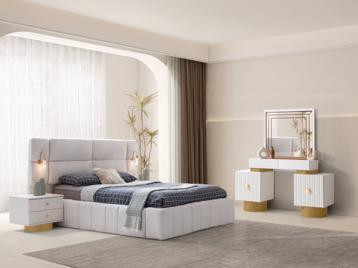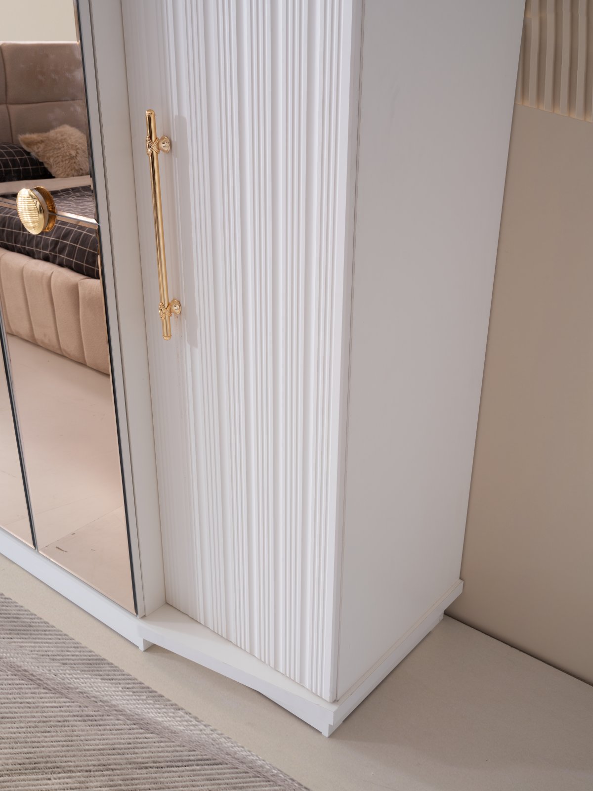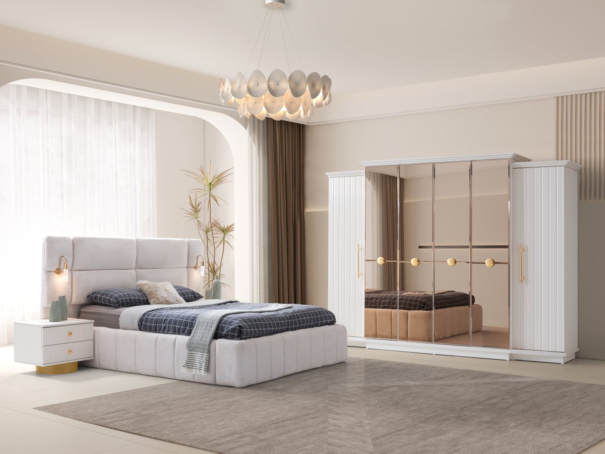Takımımız; 1 adet 6 kapılı dolap, 1 adet şifonyer, 2 adet komodin ve 1 adet başlıktan oluşmaktadır. Ürünlerimizin tamamı MDF malzemeden üretilmiştir. Komodin ve şifonyerin ayakları iskelet üzerine kaplama yapılmış şekilde tasarlanmıştır. Ayrıca, komodin ve şifonyer kapakları membran kaplama ile tamamlanmıştır. Dolabın kapakları ise 2 membran ve 4 aynadan oluşmaktadır.