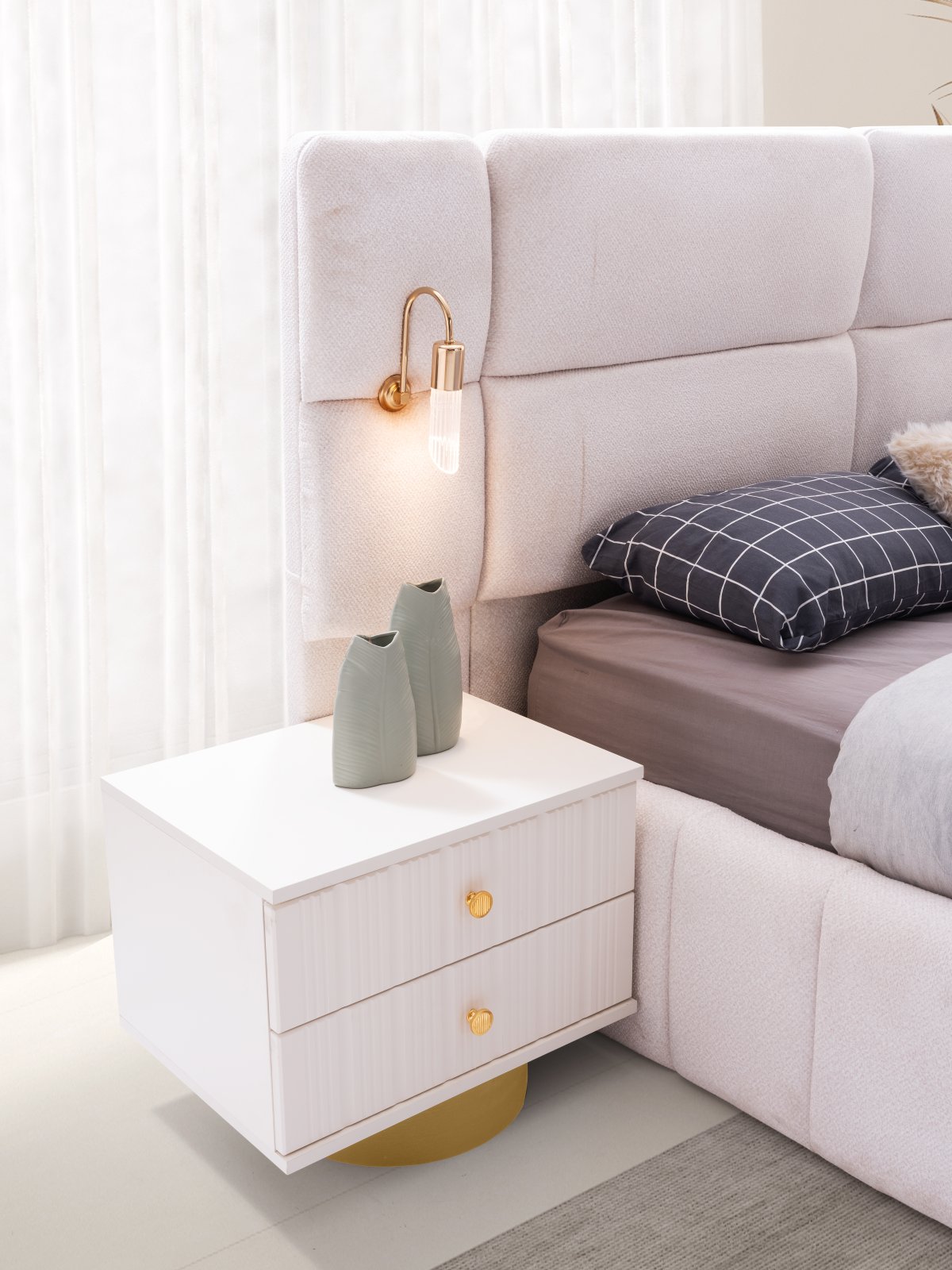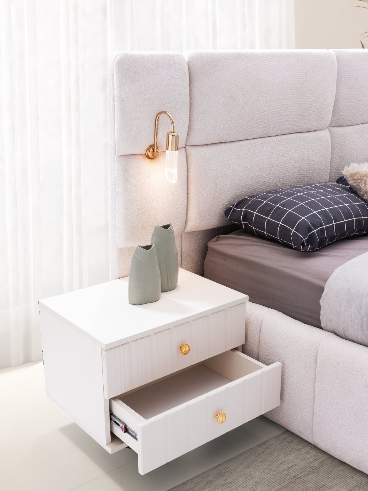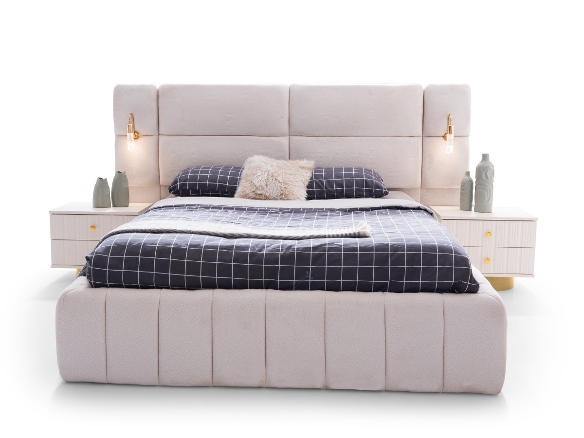 Takımımız; 1 adet 6 kapılı dolap, 1 adet şifonyer, 2 adet komodin ve 1 adet başlıktan oluşmaktadır. Ürünlerimizin tamamı MDF malzemeden üretilmiştir. Komodin ve şifonyerin ayakları iskelet üzerine kaplama yapılmış şekilde tasarlanmıştır. Ayrıca, komodin ve şifonyer kapakları membran kaplama ile tamamlanmıştır. Dolabın kapakları ise 2 membran ve 4 aynadan oluşmaktadır.