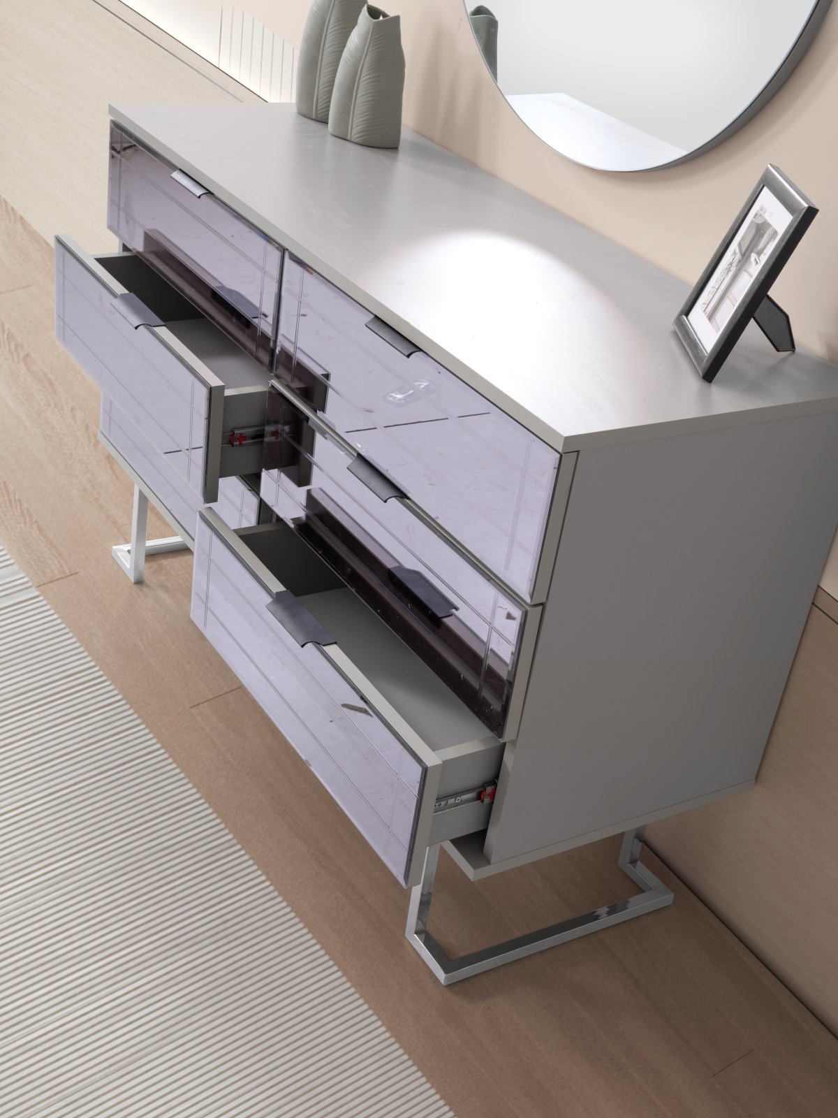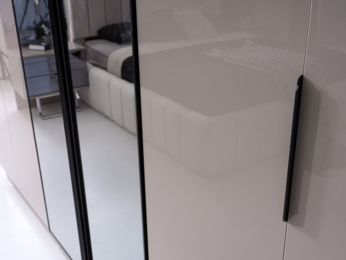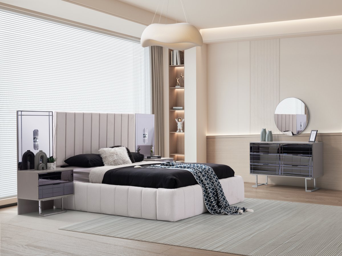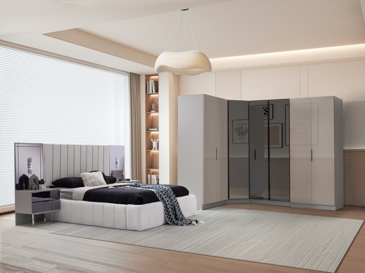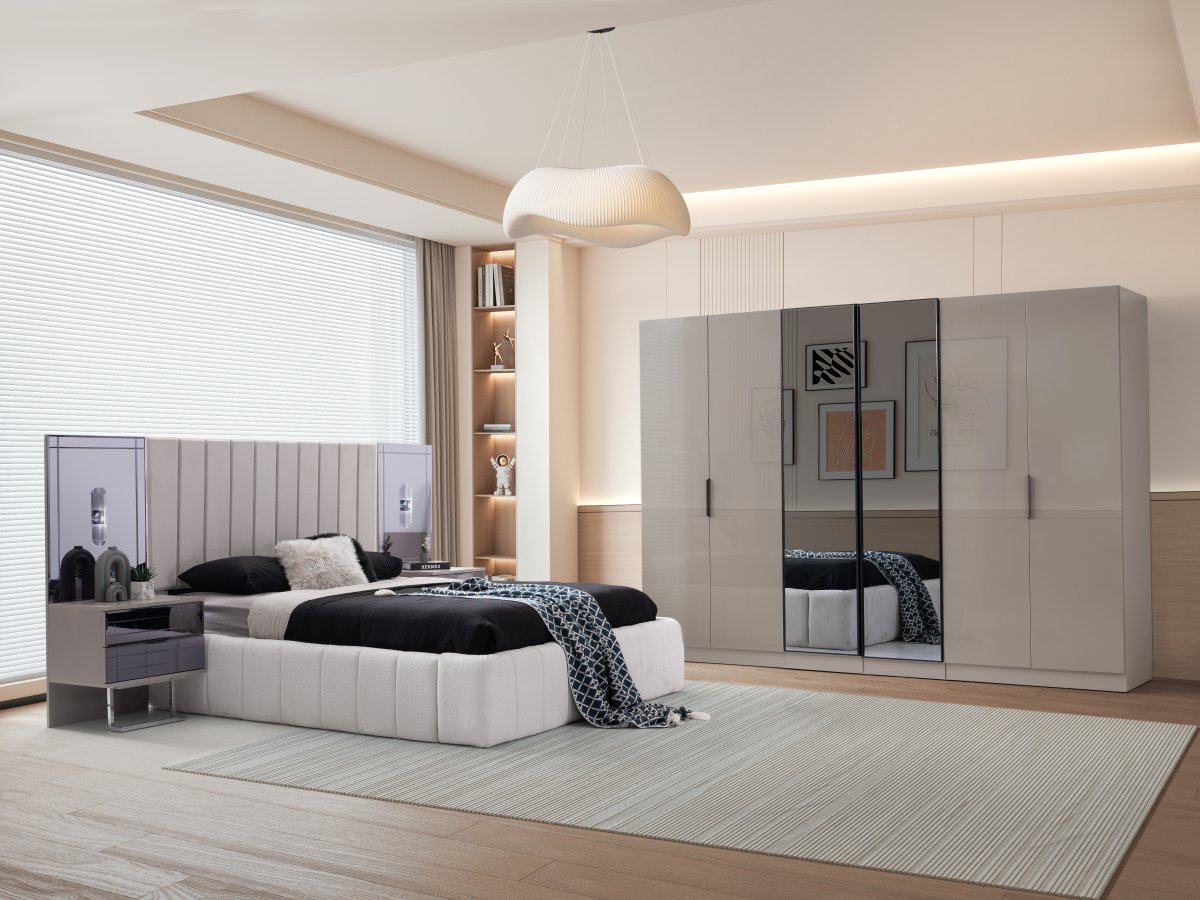 | Detay | Yatak odası takımı; 6 kapılı bir dolap, iki panolu komodin, bir şifonyer ve aynası ile bir başlık setinden oluşmaktadır. Modüler tasarıma sahip dolap, dört farklı modülden meydana gelmektedir: İki kapılı çekmeceli dolap, iki kapılı askılı dolap, tek kapılı raflı dolap ve tek kapılı askılı dolap. Tüm set, tamamen MDF malzemeden üretilmiştir. Komodin ve şifonyerin ayakları krom metalden yapılmış, çekmeceler ise kanallı füme ayadır. Dolap kapaklarından dört tanesi hyglass, iki tanesi ise reflekte cam olarak tasarlanmıştır. |