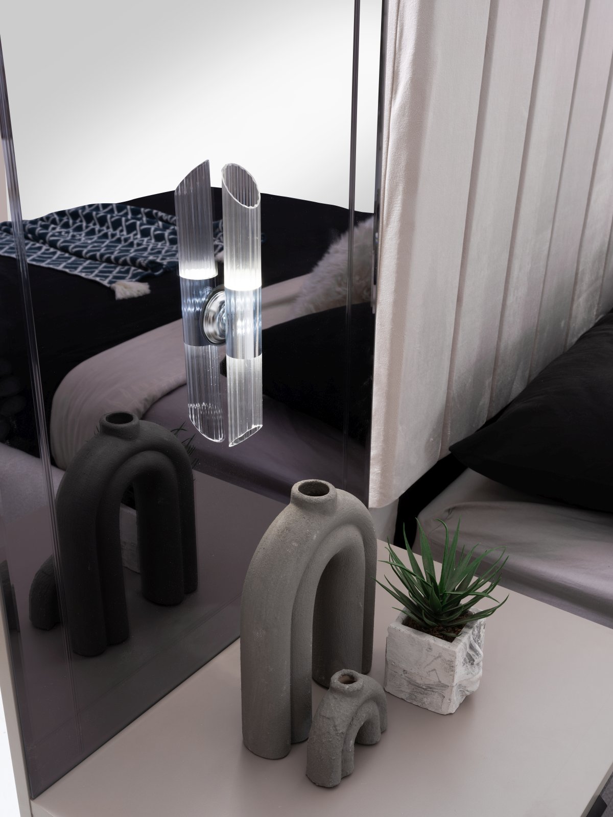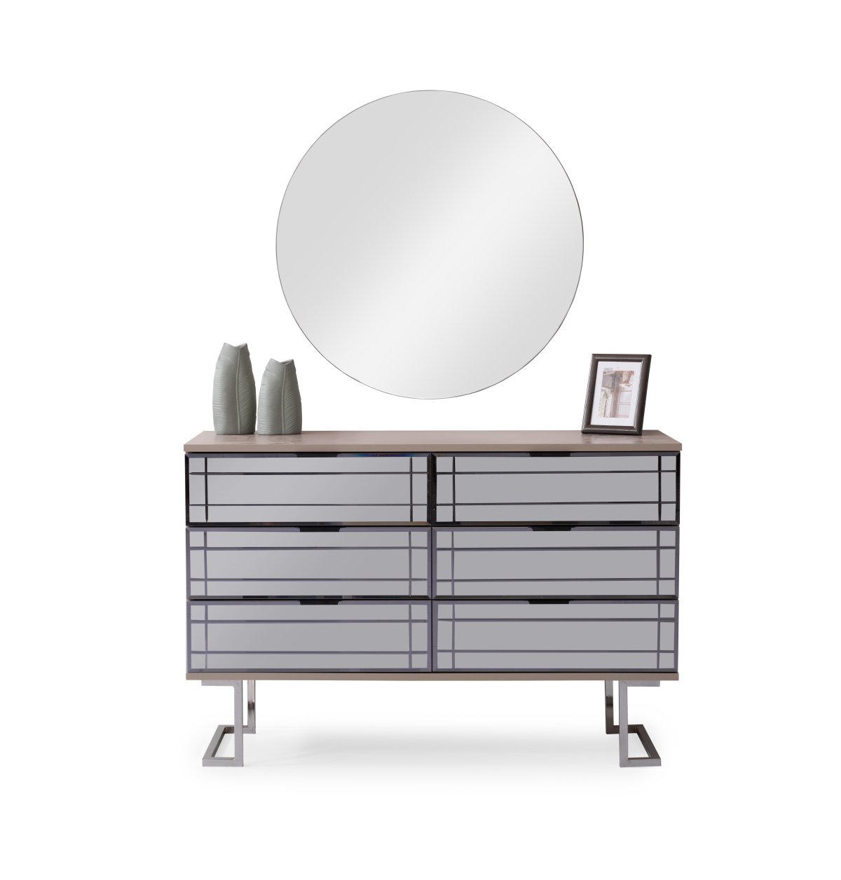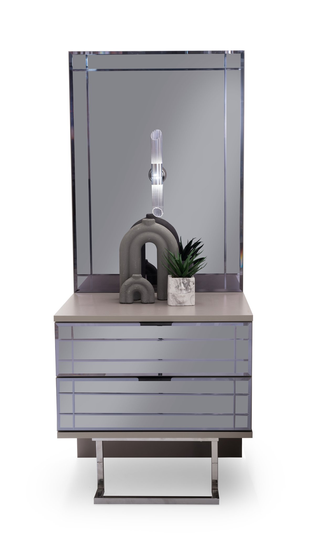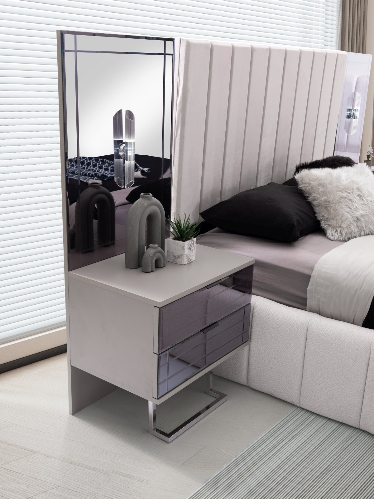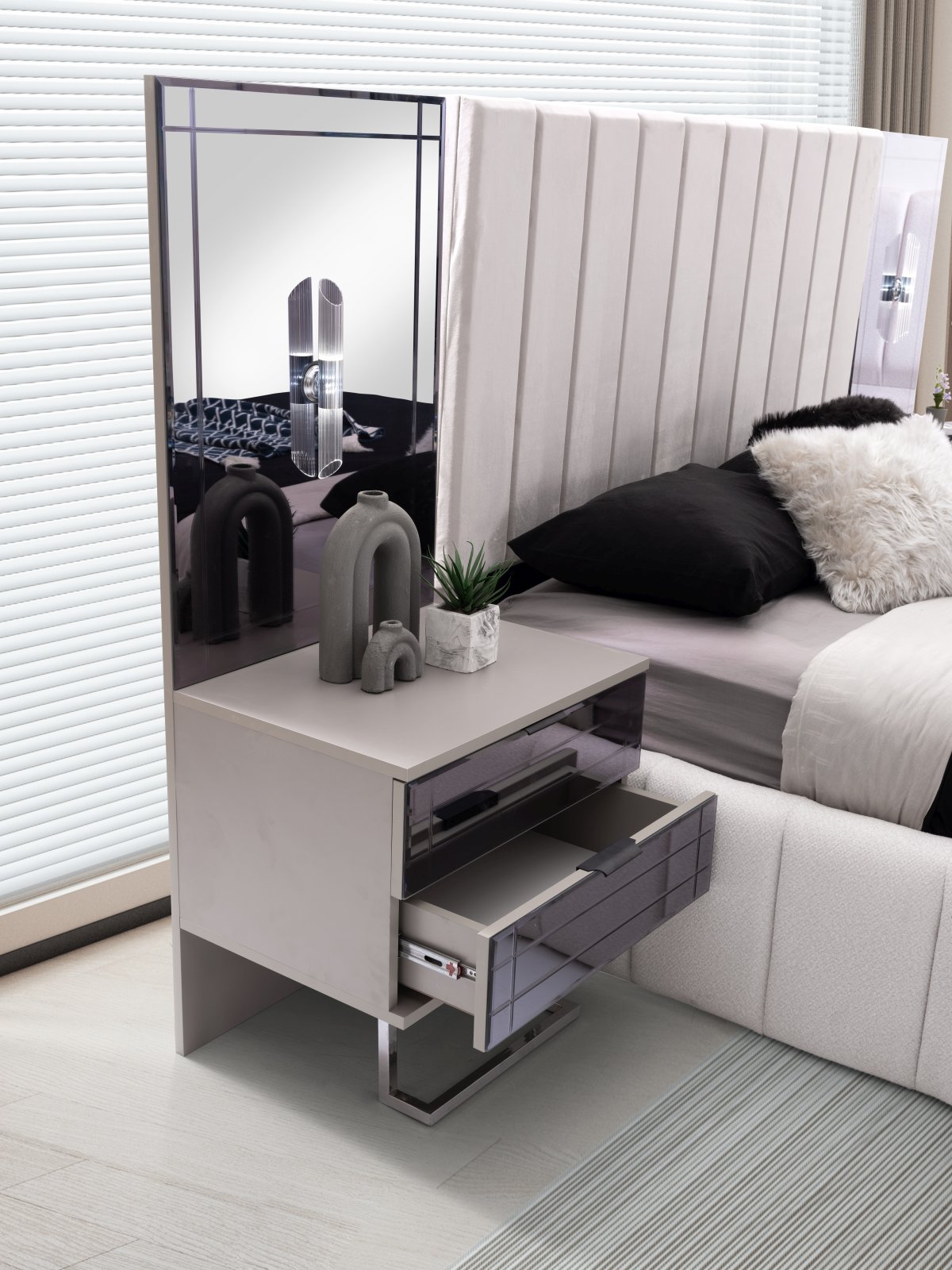 | Detay | Yatak odası takımı; 6 kapılı bir dolap, iki panolu komodin, bir şifonyer ve aynası ile bir başlık setinden oluşmaktadır. Modüler tasarıma sahip dolap, dört farklı modülden meydana gelmektedir: İki kapılı çekmeceli dolap, iki kapılı askılı dolap, tek kapılı raflı dolap ve tek kapılı askılı dolap. Tüm set, tamamen MDF malzemeden üretilmiştir. Komodin ve şifonyerin ayakları krom metalden yapılmış, çekmeceler ise kanallı füme ayadır. Dolap kapaklarından dört tanesi hyglass, iki tanesi ise reflekte cam olarak tasarlanmıştır. |