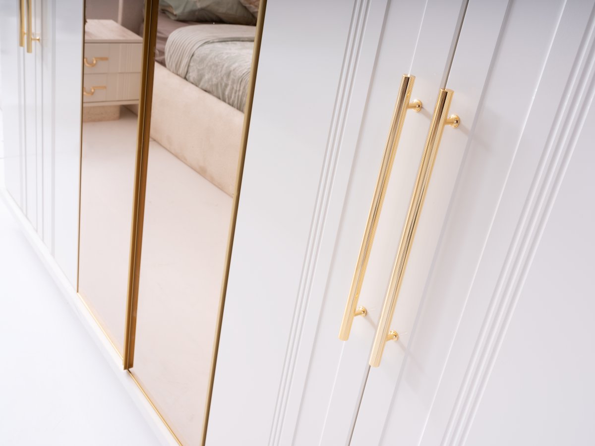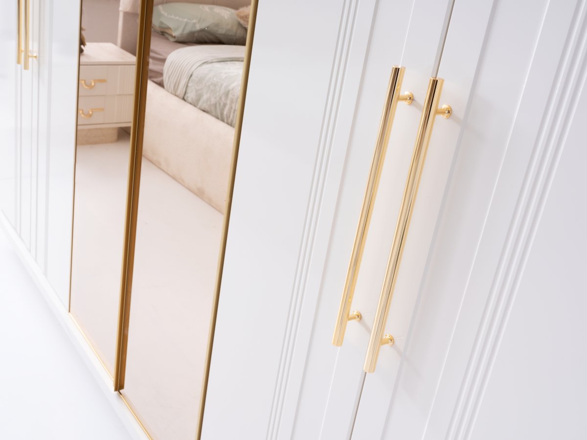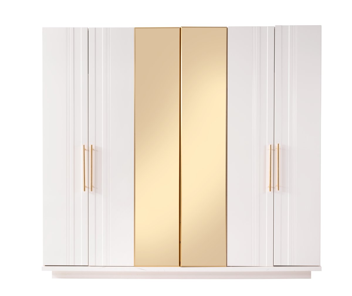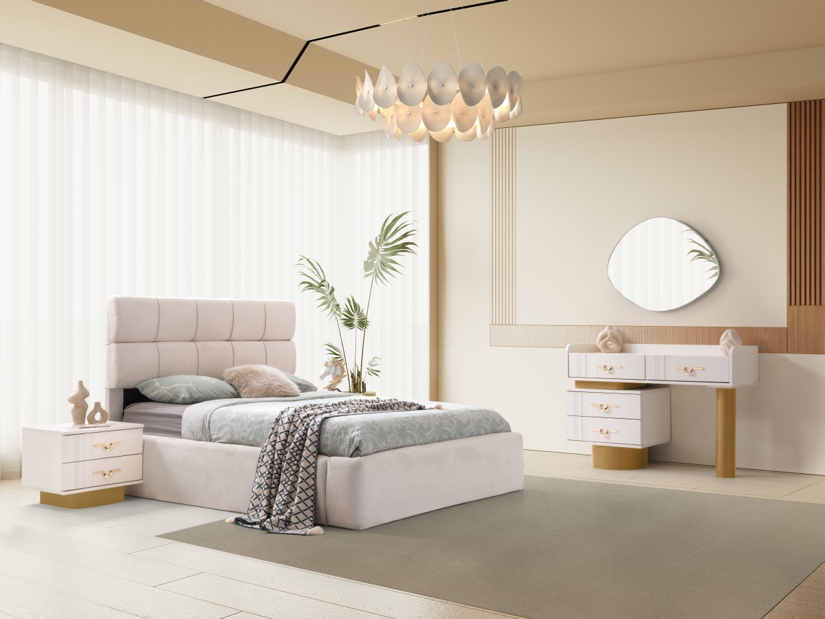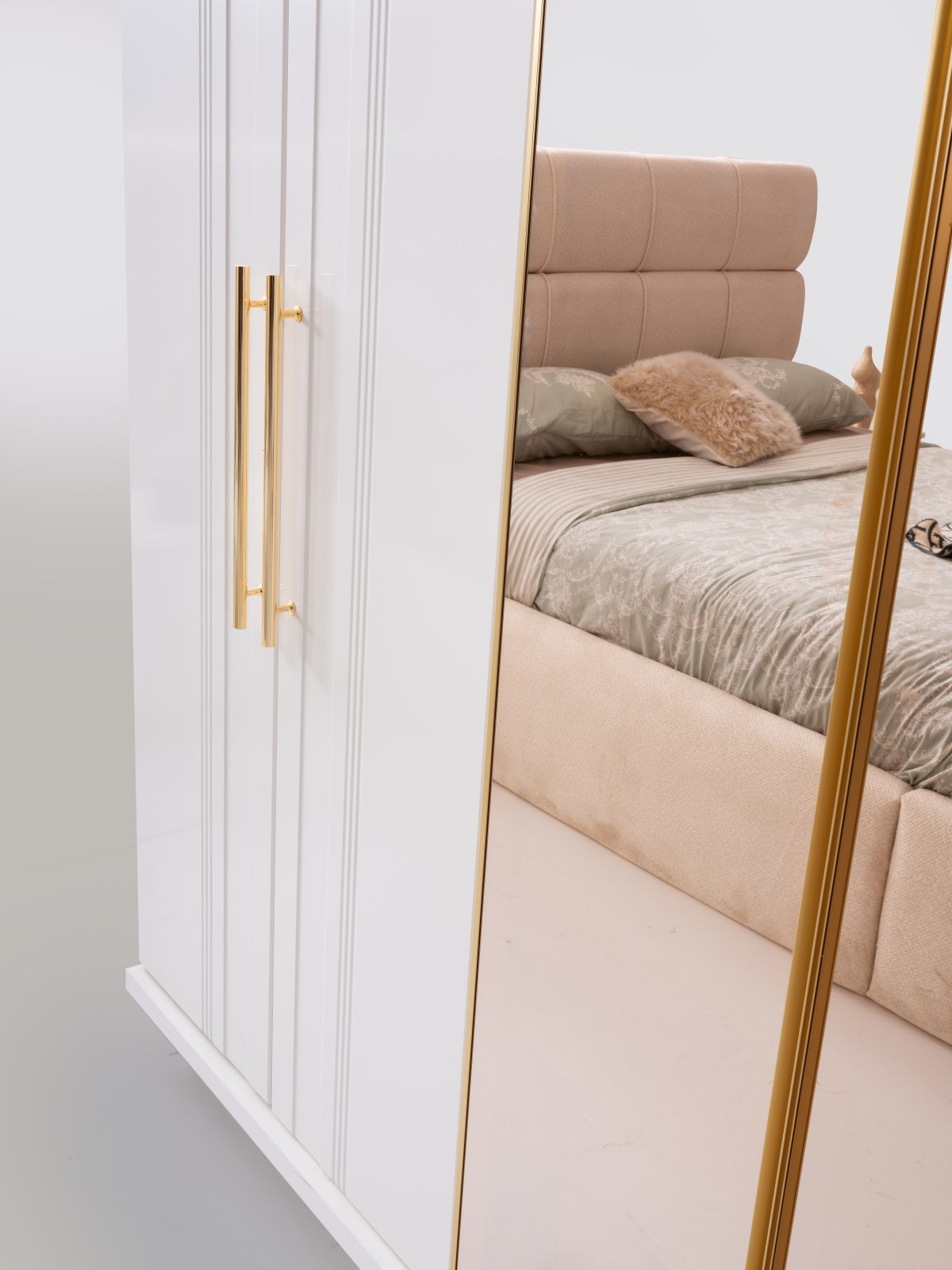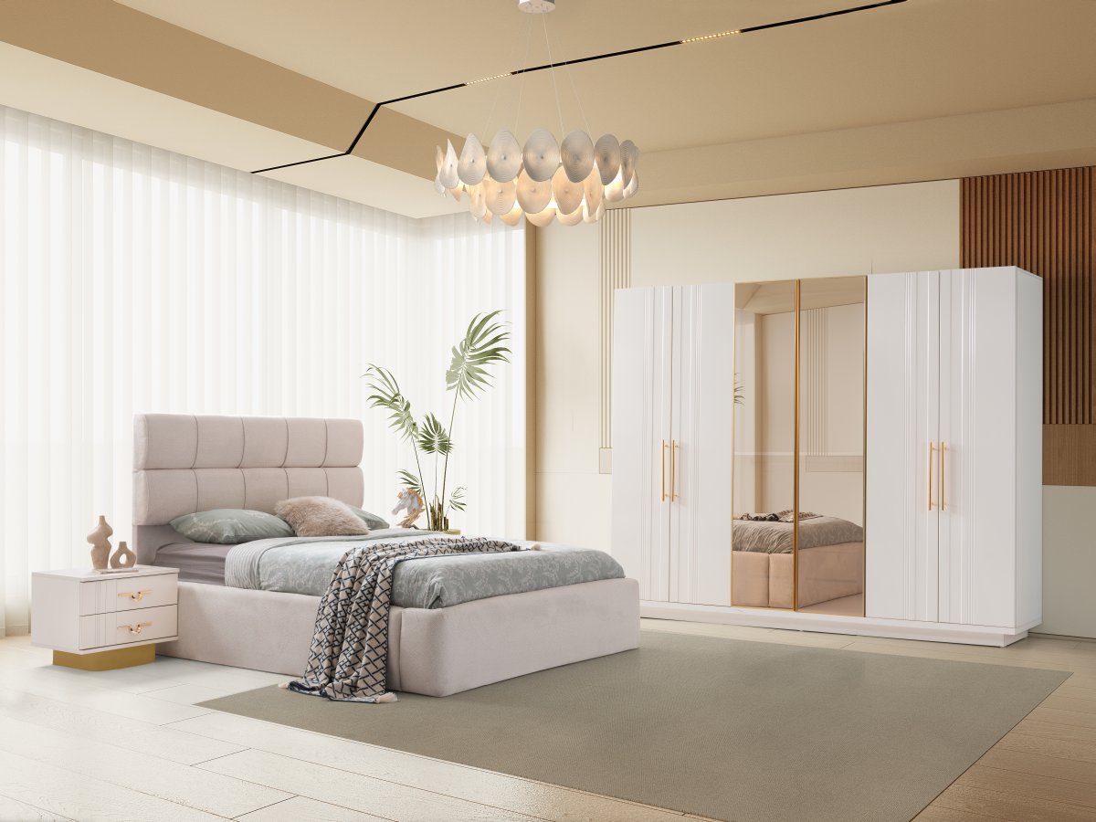 | Detay | Takımımız, altı kapılı bir dolap, şifonyer ve aynası, iki komodin ile bir başlıktan oluşmaktadır. Ürünlerin tamamı MDF malzeme kullanılarak üretilmiştir. Komodin ve şifonyer ayakları iskelet üstü kaplama olarak tasarlanmış olup, dolap, komodin ve şifonyer kapakları membran malzemedendir. |